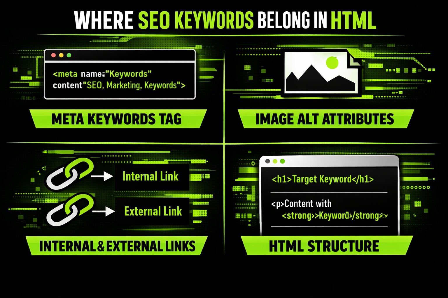 بمجرد معرفة كلماتك الرئيسية، يبدأ العمل الحقيقي. فيما يلي أهم مواقع HTML لوضع الكلمات المفتاحية، مرتبة حسب التأثير.