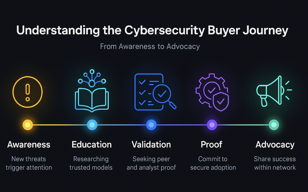يتصرف مشترو الأمن السيبراني بشكل مختلف عن جمهور B2B النموذجي. فعملية الشراء لديهم أبطأ وأكثر خصوصية وتتشكل من خلال المخاطر وليس من خلال الحداثة. يجب أن تثبت كل أداة جديدة أنها ستعزز الدفاعات دون إضافة تعقيدات أو ثغرات في الامتثال. ونتيجة لذلك، فإن الرحلة ليست قمعًا سلسًا بل سلسلة من عمليات التحقق من الصحة حيث يحتاج التسويق إلى كسب الاهتمام في كل مرحلة.
