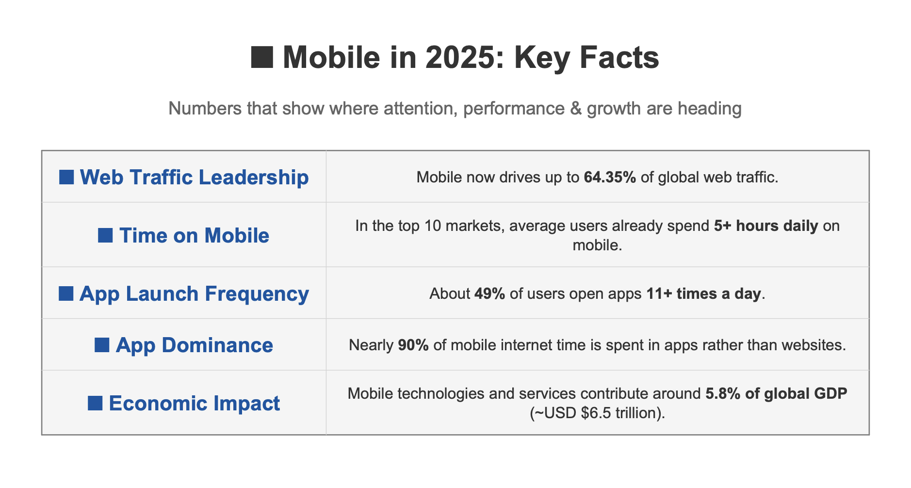 ولكن التحول الأكبر لن يكون تقنياً، بل سيكون استراتيجياً. فالاستبقاء والمشاركة سيحددان النجاح أكثر من التنزيلات، وستواجه القطاعات التي يكون فيها الامتثال والثقة أمرًا بالغ الأهمية توقعات متزايدة فيما يتعلق بالأمان والشفافية. بالنسبة للشركات في مجالات البرمجيات كخدمة وخدمات البرمجيات كخدمة وخدمات الأعمال بين الشركات وخدمات الألعاب الإلكترونية والأمن السيبراني والبالغين والتجارة الإلكترونية والتكنولوجيا المالية، لن يدعم الهاتف المحمول النمو فحسب، بل سيكون المنصة التي ستدفعه.