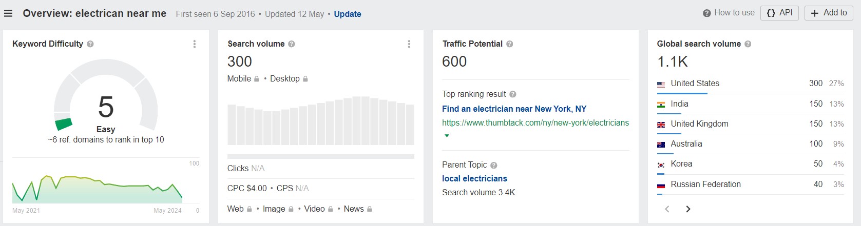 تسلط لقطات الشاشة أعلاه الضوء على طلب البحث عن الكلمة الرئيسية "كهربائي بالقرب مني" على Google. تم تصنيف صعوبة الكلمات الرئيسية على أنها سهلة، مع وجود ستة نطاقات إحالة فقط مطلوبة للتصنيف في أعلى 10. ويبلغ حجم البحث عن هذا المصطلح 300 عملية بحث شهريًا، مع احتمالية مرور تصل إلى 600. تكلفة النقرة (CPC) لهذه الكلمة الأساسية هي $4.00.