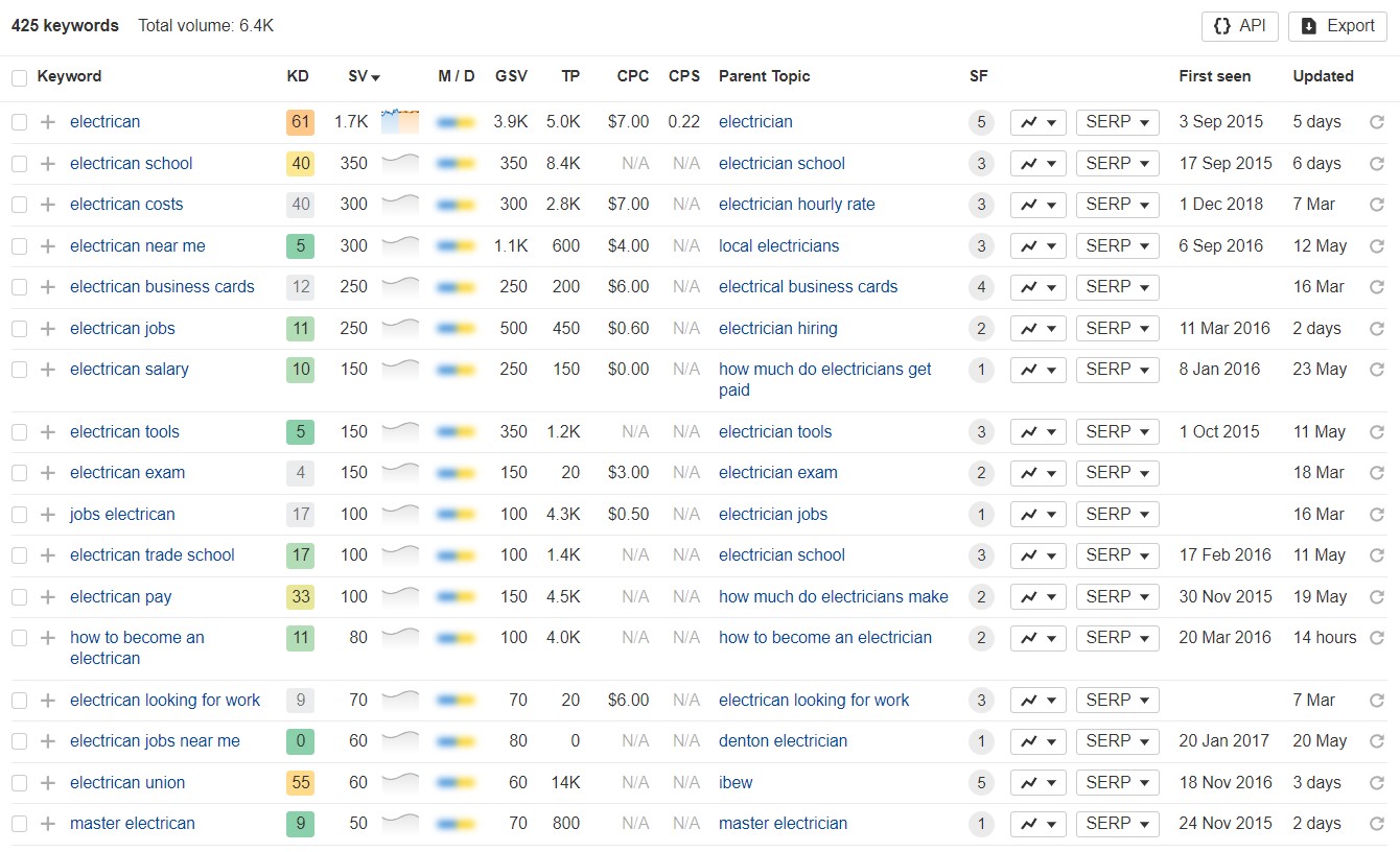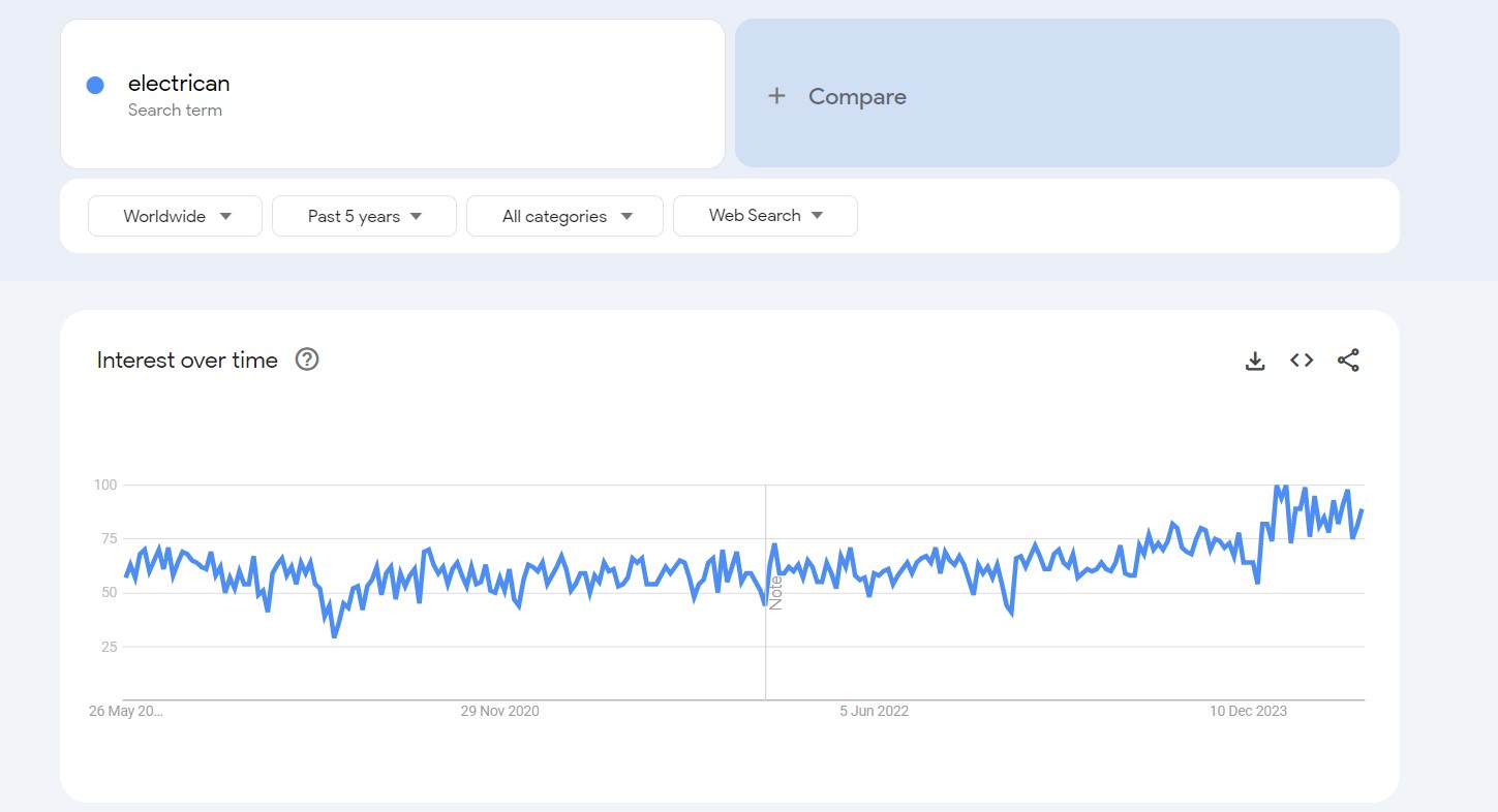 بالإضافة إلى ذلك، يبحث الأشخاص أيضًا عن خدمات ومؤهلات محددة مثل "كهربائي معتمد" و"كهربائي مرخص" و"كهربائي طوارئ بالقرب مني". كما تعد عمليات البحث الخاصة بالموقع، مثل "كهربائي لندن"، شائعة أيضًا. تشمل الكلمات الرئيسية الأخرى الجديرة بالملاحظة من البيانات "راتب كهربائي" (حجم البحث 150، 10 د.ك)، "أدوات كهربائي" (حجم البحث 150، 5 د.ك)، و"امتحان كهربائي" (حجم البحث 150، 4 د.ك).