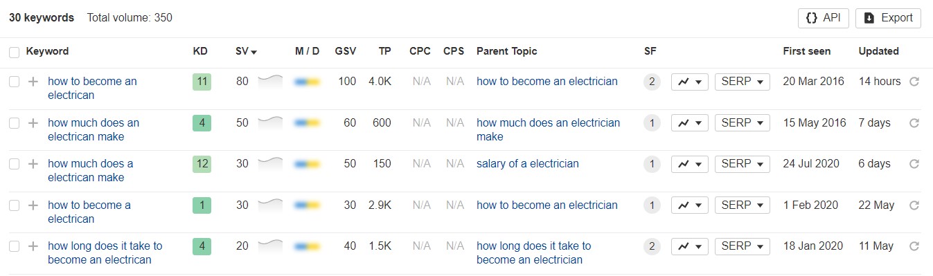 تكشف لقطات الشاشة أن الكلمة الرئيسية "كهربائي" لديها حجم بحث يبلغ 1.7 ألف دينار كويتي مع صعوبة في الكلمة الرئيسية (دينار كويتي) تبلغ 61. المصطلح "كهربائي بالقرب مني" له حجم بحث يبلغ 300 دينار كويتي و5 دينار كويتي، مما يشير إلى أنه نسبيًا من السهل تصنيفها. تشمل الكلمات الرئيسية المهمة الأخرى "مدرسة الكهرباء" (حجم البحث 350، 40 دينارًا كويتيًا)، و"تكاليف الكهربائيين" (حجم البحث 300، 40 دينارًا كويتيًا)، و"وظائف الكهربائيين" (حجم البحث 250، 11 دينارًا كويتيًا).