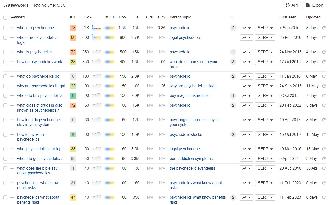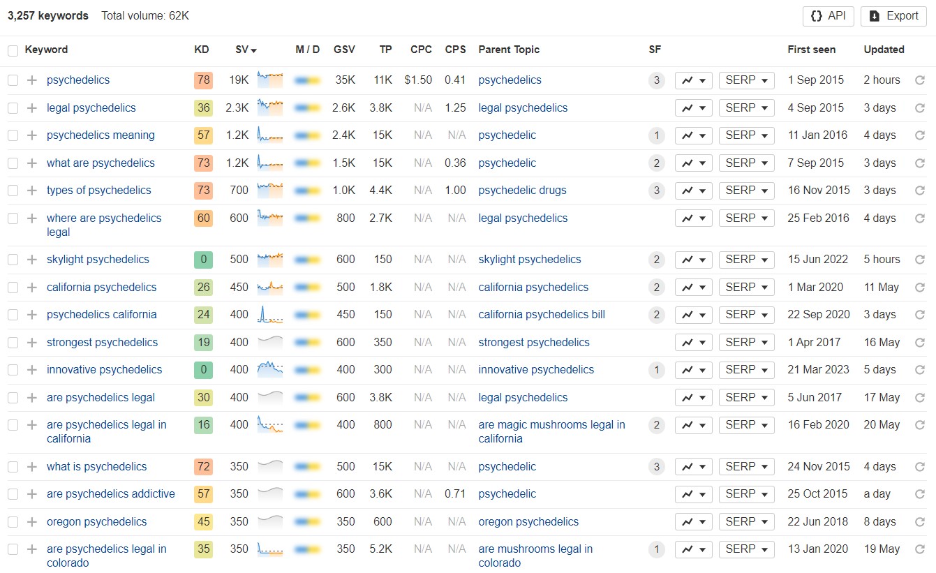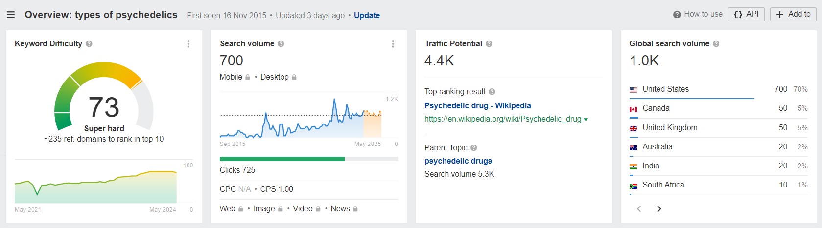 على سبيل المثال، قد تتضمن الكلمات الرئيسية ذات الطلب المرتفع مصطلحات عامة مثل "المخدرات" و"المخدرات القانونية"، والتي يتم البحث عنها بشكل متكرر محليًا وعالميًا. تعكس الاستعلامات الإقليمية المحددة مثل "California psychedelics" أو "Oregon psychedelics" الاهتمام المحلي والاستفسارات القانونية. تتراوح الأسئلة الشائعة من "ما هي المخدر؟" إلى "كيف تعمل المخدر؟" تسلط هذه الاستفسارات الضوء على فضول الجمهور والحاجة إلى معلومات موثوقة.