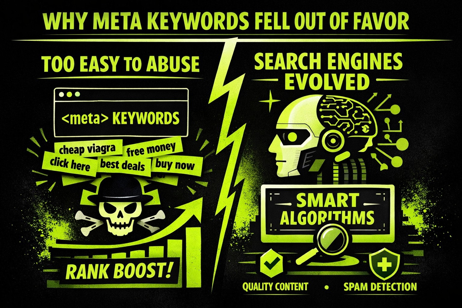 والثاني هو أن محركات البحث تطورت. أدرك جوجل أن الكلمات المفتاحية الوصفية كانت إشارة ضعيفة. يمكن لأي شخص كتابة أي شيء هناك، سواء كانت الصفحة تحتوي على هذا المحتوى بالفعل أم لا. لذا انتقلوا إلى إشارات أفضل، مثل محتوى الصفحة وجودة الروابط وسلوك المستخدم.