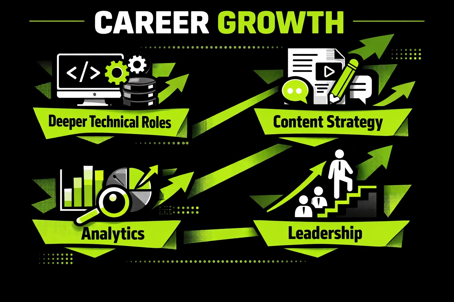 يتجه بعض المتخصصين نحو أدوار تقنية أعمق. ويركز آخرون على استراتيجية المحتوى أو التحليلات أو القيادة. غالبًا ما تتضمن المناصب العليا إدارة الفرق أو تشكيل استراتيجية البحث على مستوى الشركة.