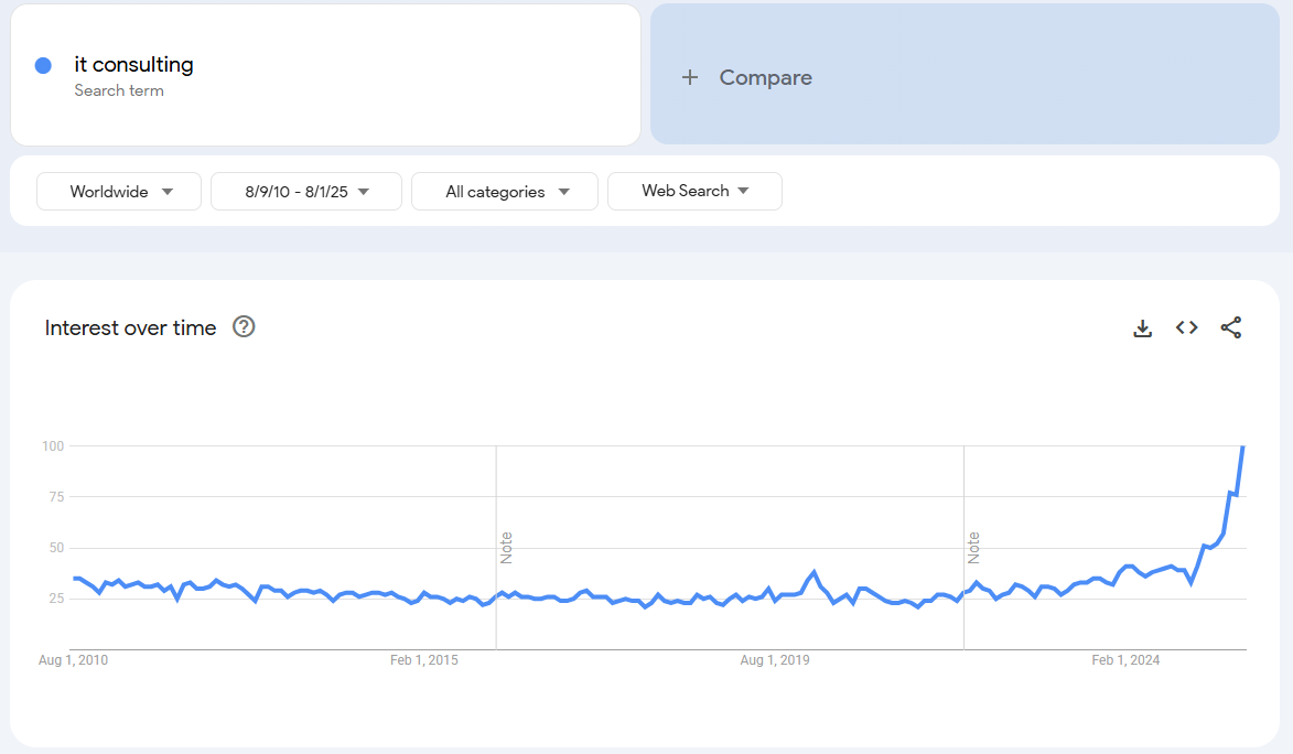 Betrachten wir den IT-Beratungsmarkt als praktisches Beispiel. Diese Branche steht für viele B2B-Herausforderungen: starker Wettbewerb, technische Entscheidungsträger, lange Verkaufszyklen und wichtige Investitionsentscheidungen. Durch die Analyse echter Suchdaten können wir sowohl die vorhandenen Möglichkeiten als auch den strategischen Ansatz verstehen, der erforderlich ist, um sie zu nutzen.