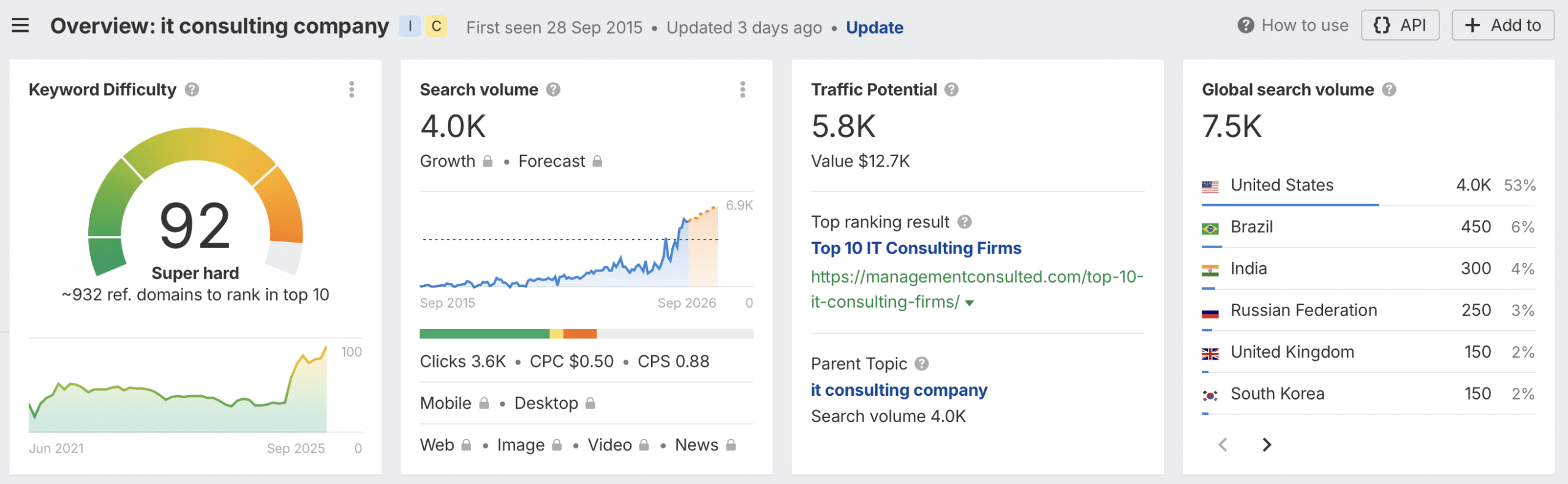 Der Keyword-Schwierigkeitsgrad von 92 für "IT-Beratungsunternehmen" ist nicht nur eine Zahl - er ist ein Marktsignal, das auf einen reifen, wertvollen Markt hinweist, in den etablierte Akteure stark investiert haben. Ein hoher Wettbewerb bedeutet aber auch einen hohen wirtschaftlichen Wert und eine starke Kaufabsicht. Der strategische Schritt? Bauen Sie zunächst Autorität durch Long-Tail-Inhalte auf ("IT-Beratung für Fertigungsunternehmen" hat oft 40-60 Punkte weniger Wettbewerb), und erweitern Sie dann allmählich auf wettbewerbsfähige Primärbegriffe, wenn die Domain-Autorität wächst.