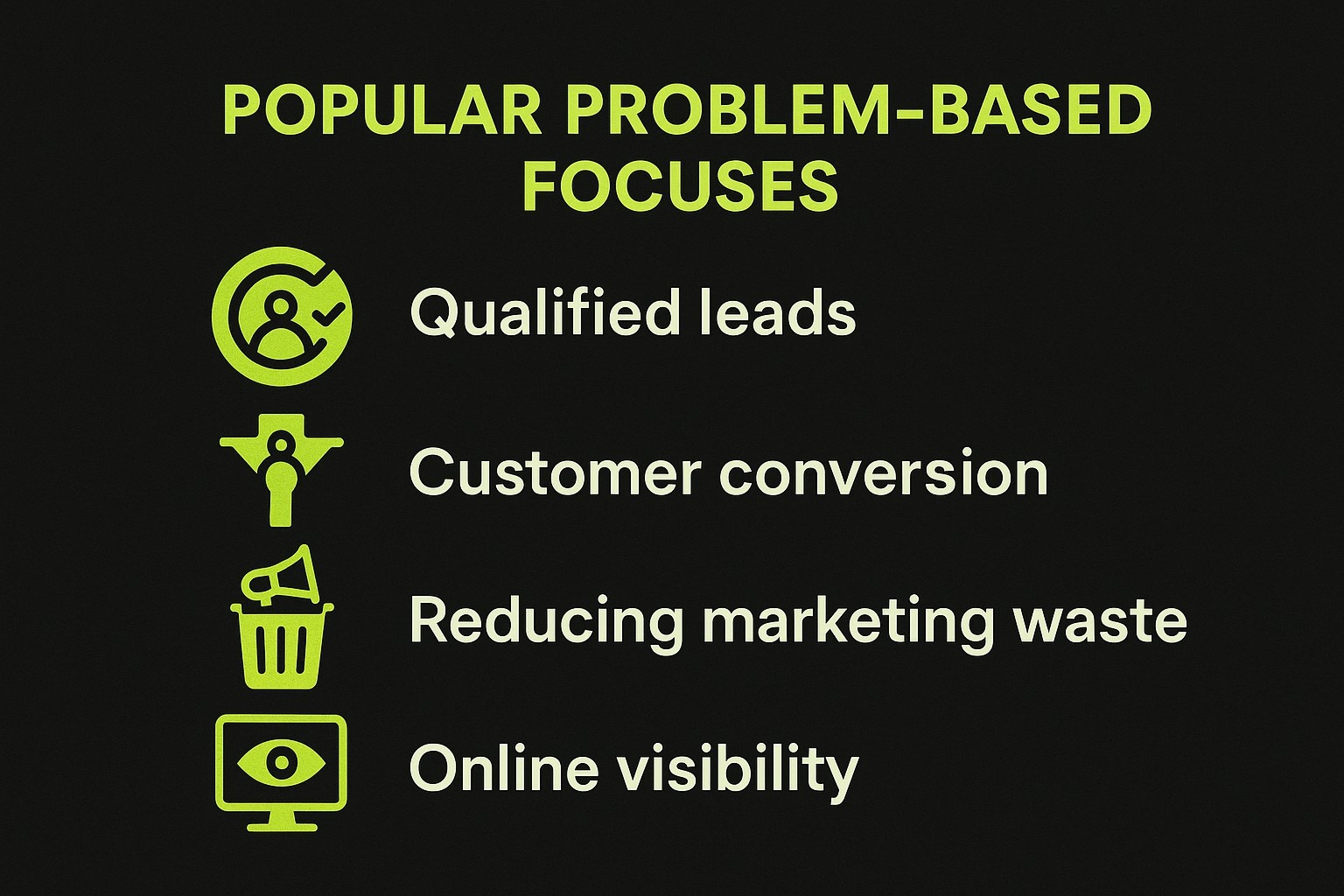 Todas las pequeñas empresas se enfrentan a diferentes retos. Algunas necesitan aumentar su visibilidad en Internet, otras necesitan cultivar sus clientes potenciales de forma más eficaz y otras necesitan optimizar su proceso de ventas de principio a fin. Adaptamos nuestras estrategias para alcanzar estos objetivos: