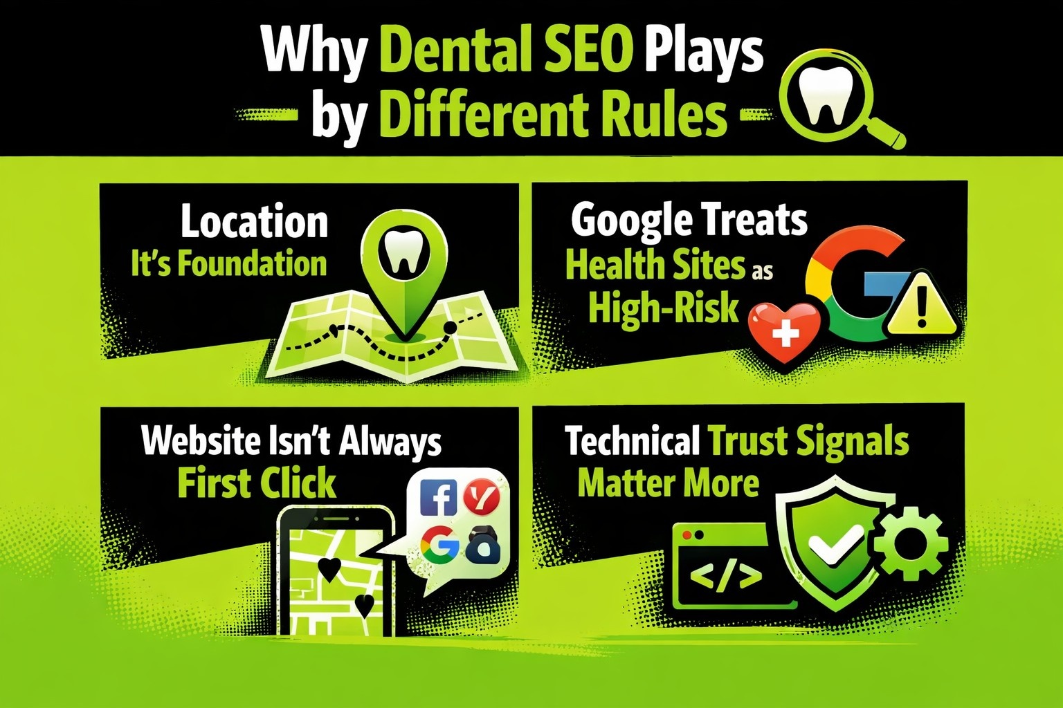 Si está aplicando una lista de comprobación SEO general a un sitio dental, es probable que no esté entendiendo nada. Las reglas son diferentes, y también lo es el nivel de responsabilidad.