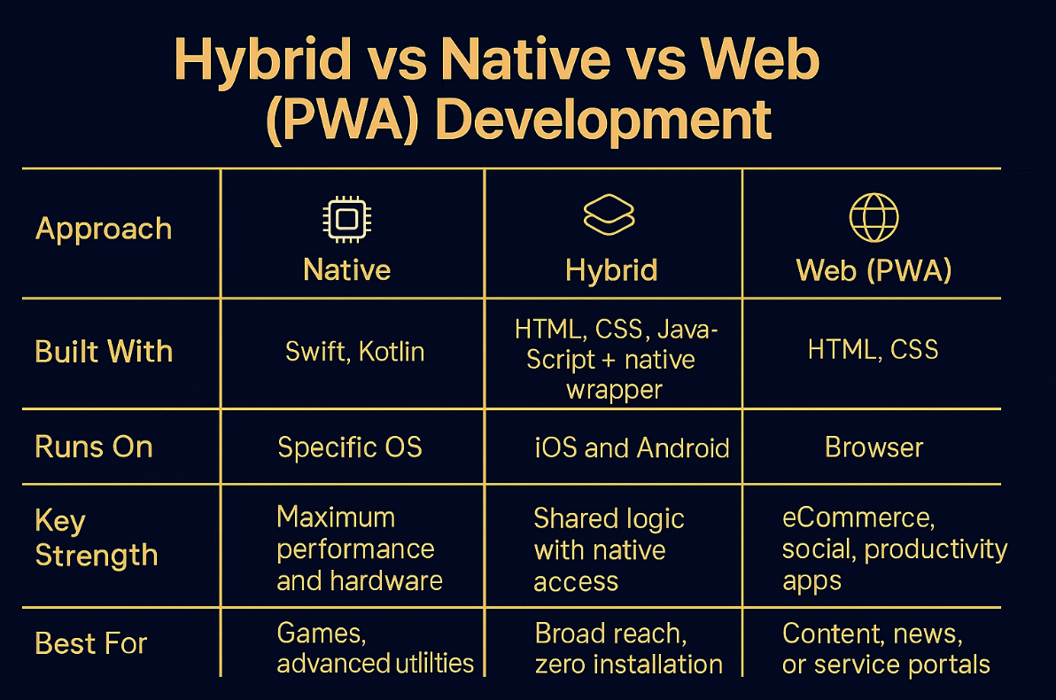 There is no universal “best” method. The right choice depends on a project’s goals, budget, and technical demands. Many teams now combine these models, using hybrid for broad release, then extending specific features with native modules when deeper system integration is required.