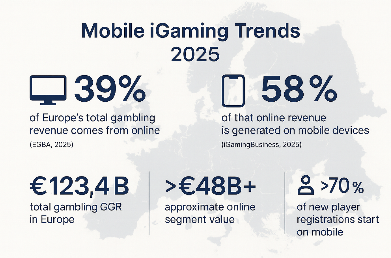 In 2025, mobile has become the main environment for iGaming, accounting for most player activity across regulated markets. According to the European Gaming and Betting Association (EGBA), online gambling now makes up 39% of Europe’s total gambling revenue, with more than 58% of that activity occurring on mobile devices (iGamingBusiness, 2025).
