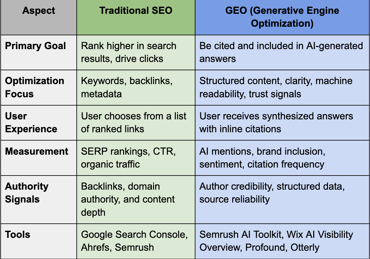 Hoewel SEO en GEO het gemeenschappelijke doel hebben om de zichtbaarheid te verbeteren, zijn de mechanismen erachter heel verschillend. Traditionele SEO gaat over rangschikking voor klikkenterwijl GEO ongeveer geciteerd binnen AI-gegenereerde antwoorden. Het begrijpen van deze verschillen is essentieel om te weten hoe beide kunnen samenwerken in een moderne zoekstrategie.
