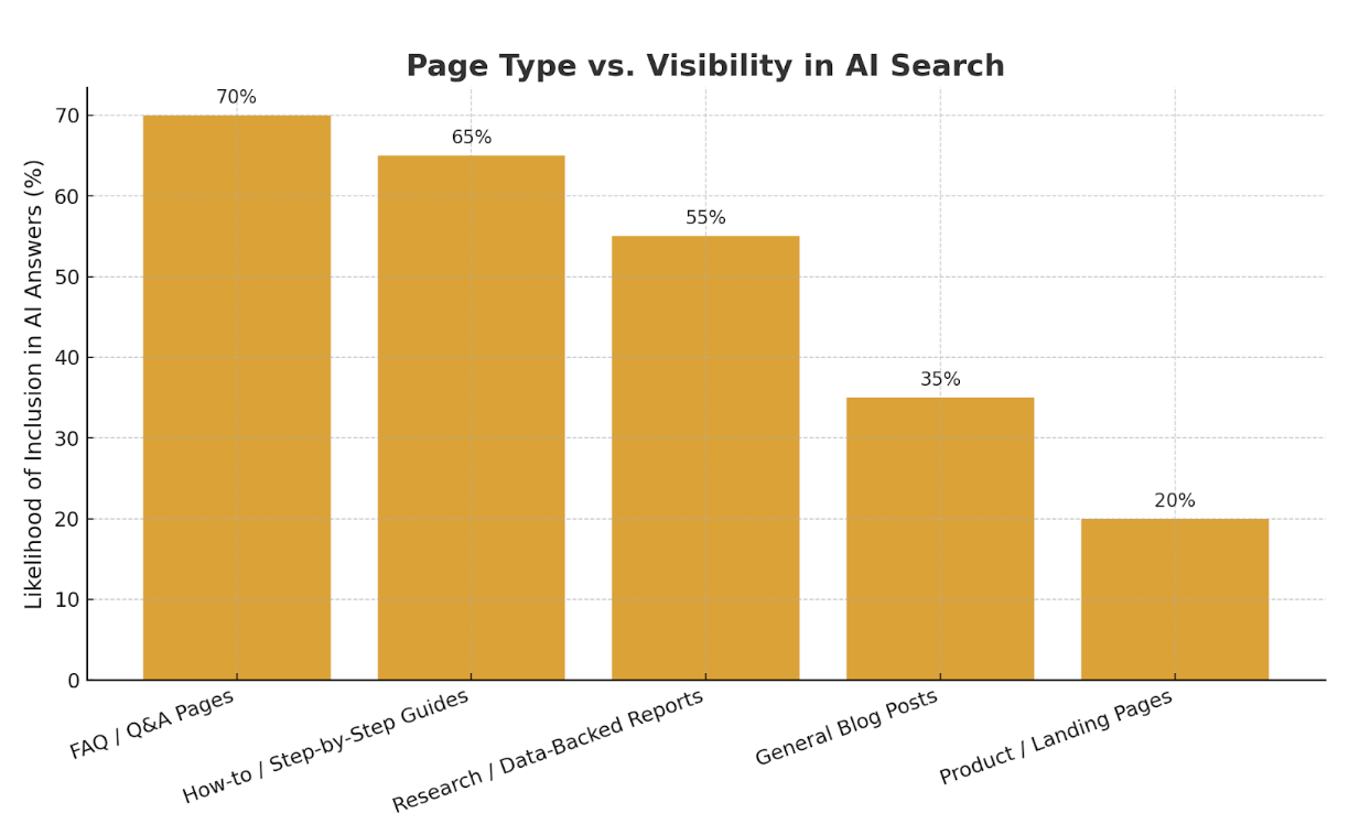 Bepaalde paginatypes hebben veel meer kans om opgenomen te worden in AI-antwoorden. Gestructureerde indelingen zoals FAQ's en how-to gidsen presteren consequent beter dan promotiepagina's.