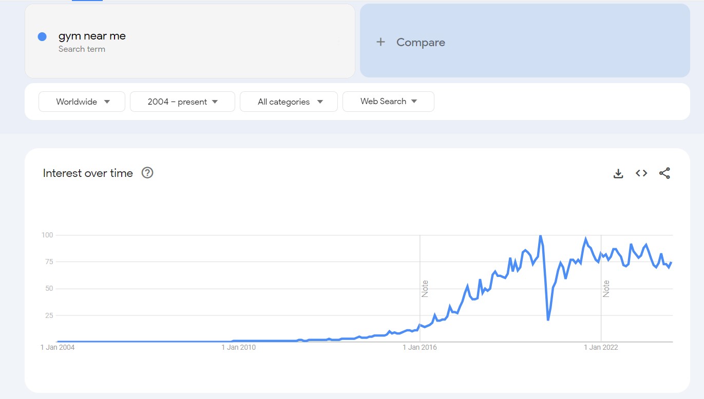 1. Zoektermtrends: De term 'sportschool bij mij in de buurt' heeft van 2004 tot heden een consistente groei laten zien, wat wijst op een toenemende belangstelling voor het vinden van lokale sportscholen. Deze trend is vooral sterk in de VS, Australië en Canada.