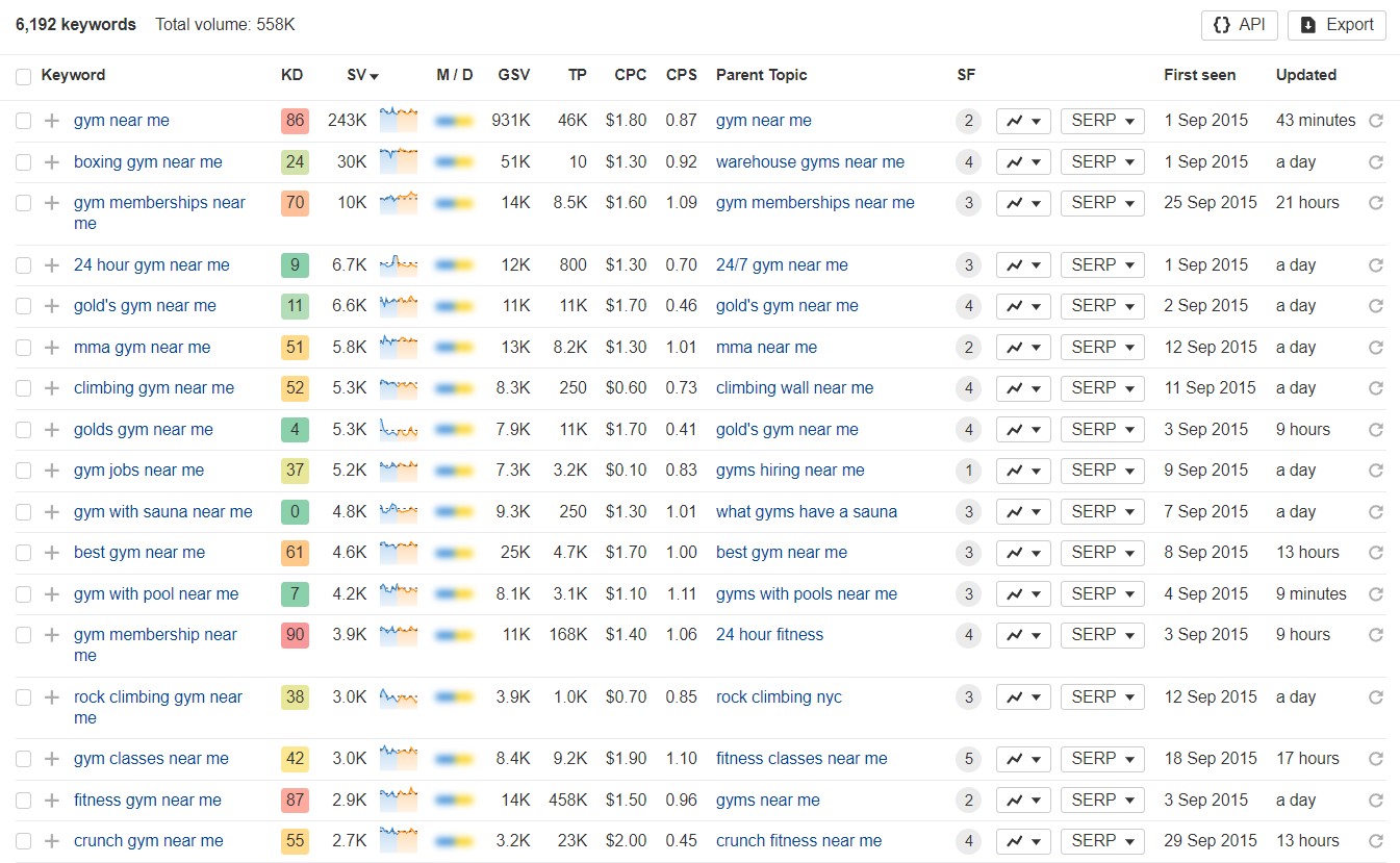 • 'Sportschool bij mij in de buurt' heeft een zoekwoordmoeilijkheid (KD) van 86 en een zoekvolume (SV) van 243K, waardoor het zeer concurrerend is.