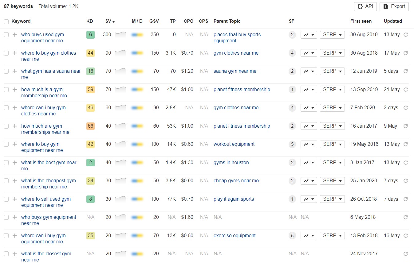 Sommige van uw potentiële klanten kunnen hun vragen ook als vragen formuleren. Bijvoorbeeld 'hoeveel kosten sportschoolabonnementen bij mij in de buurt' (KD 66, SV 60) of 'wat is de beste sportschool bij mij in de buurt' (KD 40, SV 50). Door deze op vragen gebaseerde zoekwoorden op te nemen, kunt u beter inspelen op de specifieke behoeften van uw doelgroep, waardoor de betrokkenheid en conversiepercentages worden verbeterd.
