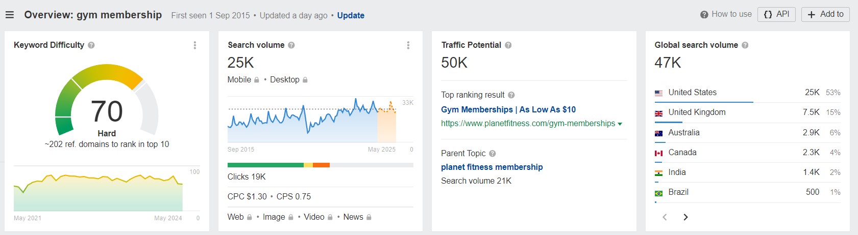 2. Moeilijkheidsgraad en volume van zoekwoorden: Voor de term 'lidmaatschap van een sportschool' wordt de moeilijkheidsgraad van het zoekwoord beoordeeld op 70, wat als moeilijk wordt beschouwd en duidt op grote concurrentie. Er zijn ongeveer 25.000 zoekopdrachten per maand, met een wereldwijd zoekvolume van 47.000. Het hoogste resultaat voor dit zoekwoord heeft een aanzienlijk verkeerspotentieel, geschat op 50.000.