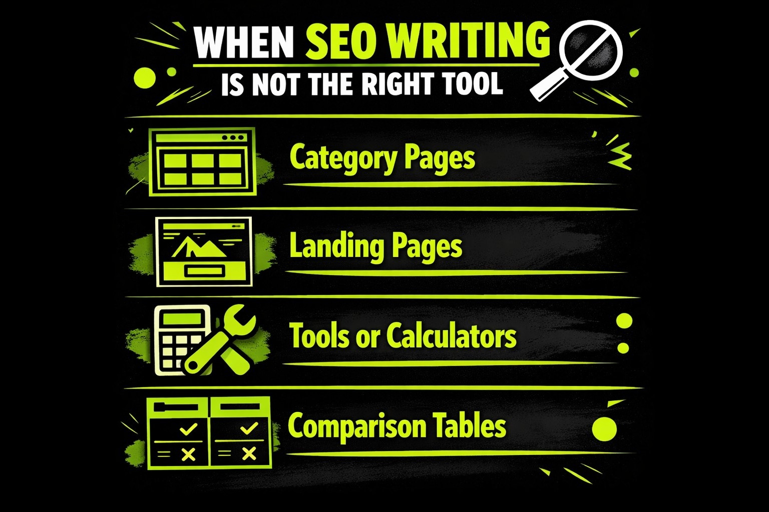 SEO writing is not a universal solution. Some queries are better served by formats that prioritize speed, clarity, or direct action, such as: