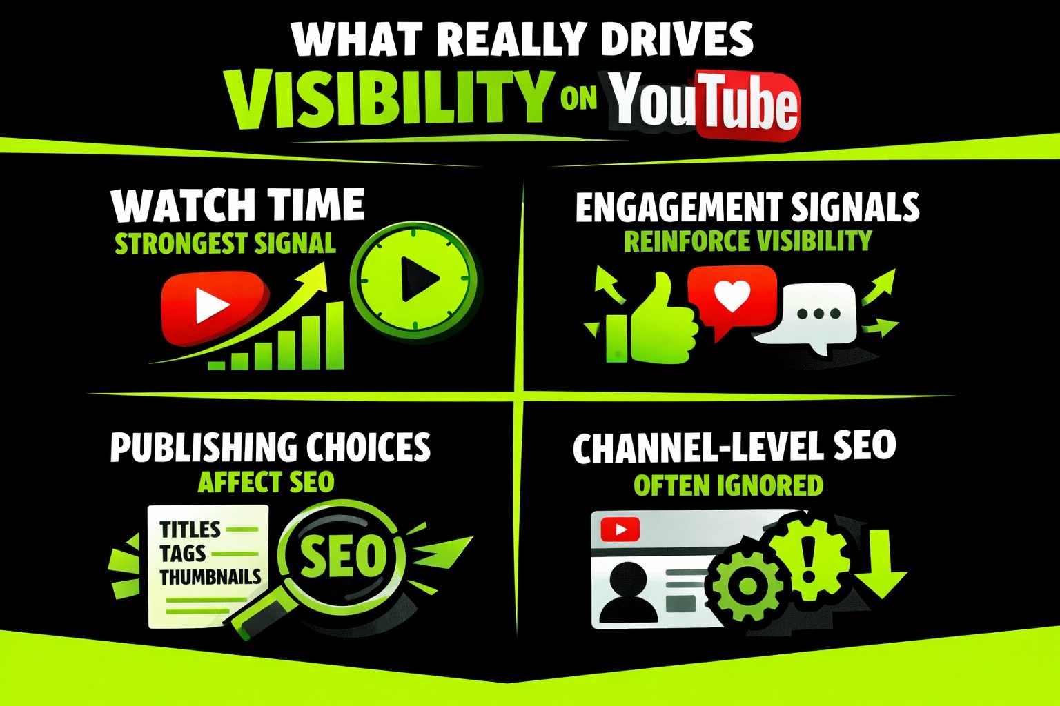 Unlike traditional website SEO, YouTube cannot “read” your video content directly. It relies on signals around the video to make decisions. These include text-based inputs like titles and descriptions, but also behavioral data like watch time and interaction.